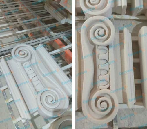 Эти декоративные барельефы из пенополистирола изготовили посредством контурной резки на оборудовании с числовым программным управлением по 3D модели. Для увеличения эстетичности и эффективности эксплуатационных свойств укрепили их мастичным кварцевым покрытием, которое нанесли методом напыления.